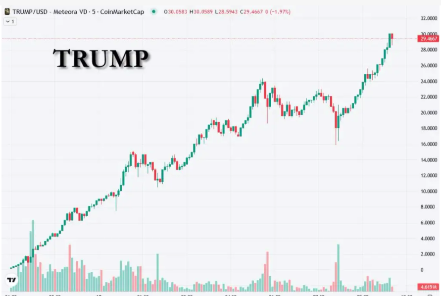 不过在全球一片半信半疑中,发布在川普官方社交媒体渠道上的贴文迟迟未删除,这让市场开始感到安心,$TRUMP也一路飙升,Dexscreener数据显示,$TRUMP从昨日开盘时的0.18美元左右不断飙升,迄今已涨至35.59美元,涨幅超过19000%。