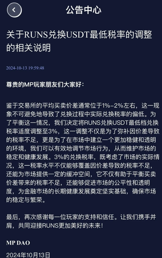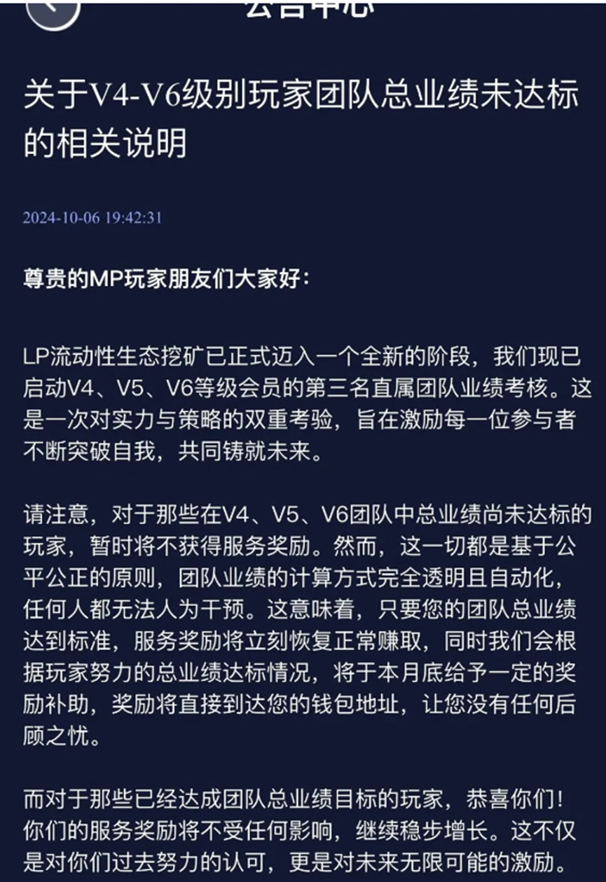 随着项目的崩盘迹象越来越明显,MP生态平台开始频繁发布公告,试图稳住投资者。他们取消了90天的质押周期,延长了其他周期的质押时间;对上星级的团队长进行了新增业绩的考核,没有新增业绩就取消奖励;提高了手续费用兑换……这些措施无一不是在为跑路做准备。而一些明智的团队长已经开始通知下级停止宣传,陆续撤场。他们深知,这个项目已经走到了尽头。