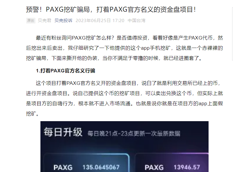 在2023年6月的时候,是贝壳投诉首先曝光了PAXG挖矿平台诈骗,结果没有几天,项目方就崩盘跑路,席卷几千万美元跑了,你根本就提现不了,因为早就被搞到海外了。